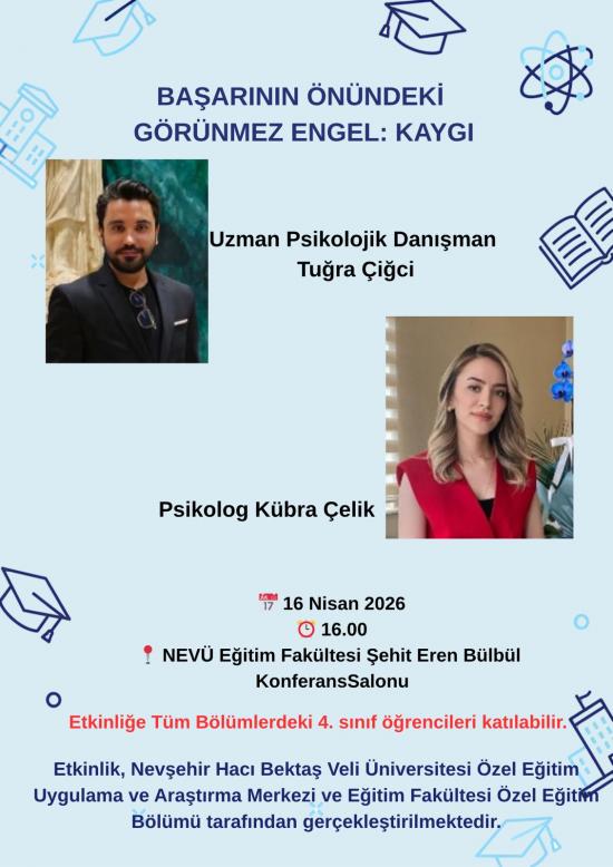 Nevşehir Hacı Bektaş Veli Üniversitesi Eğitim Fakültesi Şehit Eren Bülbül Konferans Salonu’nda gerçekleştirilecek olan “Başarının Önündeki Görünmez Engel: Kaygı” başlıklı etkinlikte, kaygının akademik ve bireysel başarı üzerindeki etkileri ele alınacaktır.